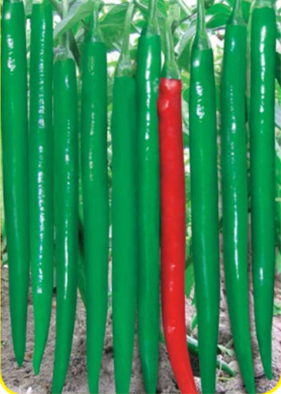 中 早 熟,杂交一代,植株生长势强,果 长 28-35 厘米,横径 1.5-1.7 厘 米, 膨果速度极快,椒 条 光 亮 顺直,后期果形一致,青果绿色,红果鲜艳,辣味香浓,抗病,抗逆性强,座果率高,采收期长,亩产5000 公 斤 左右,是全国各地春、秋保护地及露地栽培的首选品种。