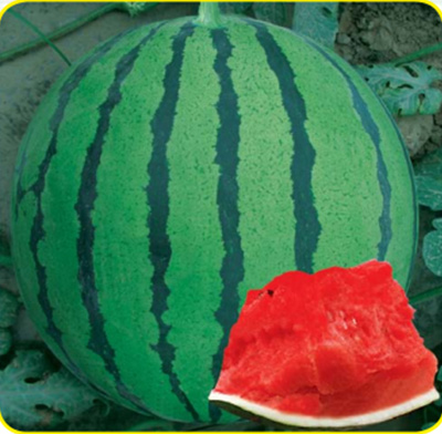 育种家培育的早熟高档西瓜新品种,果实圆型,底色绿,上覆墨绿色细条带,条带美观,有蜡粉,瓤色大红,脆甜爽口,品质优,耐低温弱光性好,耐贮运,正常生长条件下,28 天左右即可上市,单瓜重可达 6-9 公斤,产量高,效益好,深受瓜农瓜商青睐。